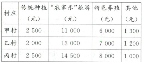 发展农村经济、增加农民收入,是建设社会主义新农村的中心任务。为了解农民收入现状,一调查小组抽取了某镇的三个村,采用问卷方式对三个村农民家庭年纯收入情况进行了调查,发现农民收入的主要来源有:传统种植、“农家乐”旅游、特色养殖和其他。三个村的户均年纯收入的分类统计结果如下表。