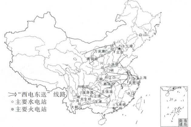 材料一 我国东部地区人口稠密、经济发达,能源需求和消费量大(以煤炭为主),但能源贫乏,需从外区调入。我国西部地区可开发的水电、煤炭资源丰富,但经济发展滞后,能源的需求量较小。“西电东送”就是把西南、西北地区丰富的能源转化为电能,通过输电线路,向东部地区送电的工程。“西电东送”有利于促进西部地区电力工业的发展,能源消费结构的改善和生态环境的建设,还可带动相关产业的发展。“西电东送”改变了东部地区电力供应不充裕、能源结构不合理的状况,并在一定程度上缓解了东部日益严重的环保压力。