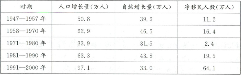 1.第二次世界大战以后,新加坡外来移民数量总体在不断上升,但在1971—1980年移民数量锐减。 原因:早期外来移民数量总体不断上升的原因是新加坡大力发展了劳动密集型产业,需要大量的劳动力,吸引了周边地区人口大量迁入;1971—1980年移民数量锐减与国家政策有关,即为保证本国人口充分就业,严格控制外来人口迁入;20世纪90年代以后,尽管新加坡劳动密集型产业已经大大减少,但新加坡发达的经济同样对外来人口的迁入具有巨大的吸引力,同时新加坡推行的自由移民政策对吸引大量外来人口起到了助推作用。