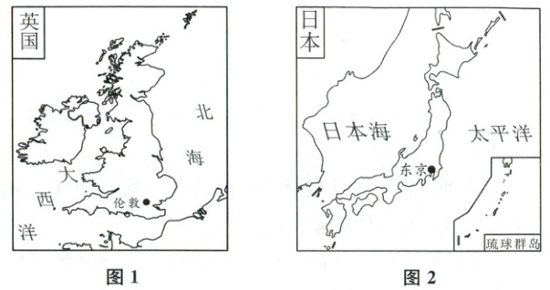日本和英国分别位于亚欧大陆的东西两侧。图1为“英国地理位置示意图”(如左下图所示),图2为“日本地理位置示意图”(如右下图所示)。
