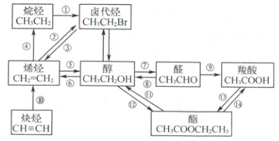 1. 请在图中所列有机化合物之间加上箭头以表示它们之间的转化关系: