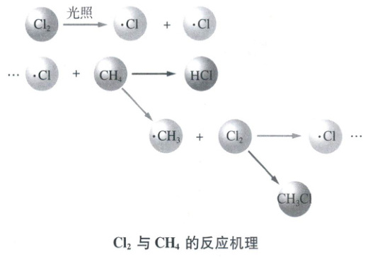 氯气分子在光照或加热条件下形成氯原子,即氯自由基(Cl·);氯自由基与甲烷分子发生碰撞时,从甲烷分子中夺得1个氢原子,生成氯化氢分子,甲烷则转变为甲基自由基(CH₃·);甲基自由基与氯气分子发生碰撞时,从氯气分子中夺得1个氯原子,生成一氯甲烷分子,氯气分子转变为氯自由基(Cl·)……在甲烷的光照氯代反应中,氯气每吸收1个光子,将会生成数千个氯甲烷分子。