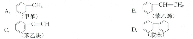 5.D 甲苯中,甲基取代了苯分子中的1个H原子,苯分子中所有原子共面,则甲苯分子中所有7个C原子都共面;苯乙烯中,苯基与跟它相连的C原子形成苯平面,乙烯基与跟它相连的C原子形成乙烯平面,二平面相交于一条直线,即碳碳单键,由于碳碳单键是可以转动的,通过转动可以使二平面共面,所以8个C原子可以都共面;苯乙炔中,存在苯平面和炔直线,炔直线上有2个C原子在苯平面上,炔直线属于苯平面,所以8个C原子可以都共面;联苯分子中,2个相交于碳碳单键的苯平面可以通过转动单键而共面,所以最多有12个C原子共面。故选D。
