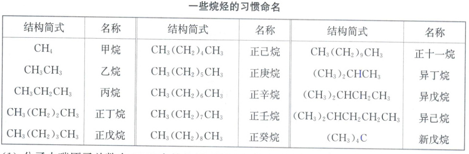(1) 分子中碳原子总数在10以内的烷烃,用天干表示,分别对应的名称为甲烷、乙烷、丙烷、丁烷、戊烷、己烷、庚烷、辛烷、壬烷、癸烷。