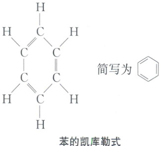 实验研究发现,苯的一取代物只有一种,说明苯中的$6$个$ C$和$6$个$ H$是相同的,在此实验事实的基础上,德国化学家凯库勒提出了苯的环状结构,称为凯库勒式,如图: