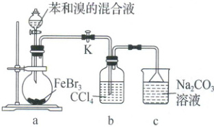 8.D 向圆底烧瓶中滴加液体前,要先打开K,以保证液体顺利滴下,A正确;装置b中$CCl_4$的作用是吸收反应过程中未反应的溴蒸气,$Br_2$溶于$CCl_4$显红色,B正确;装置c中$Na_2CO_3$溶液的作用是吸收反应中产生的HBr气体,防止污染环境,C正确;反应后的混合液经稀碱溶液洗涤可除去溴苯中的溴及部分可溶于水的杂质离子,分液后得到有机层,再水洗除去可溶于水的杂质离子,分液后得到溴苯和苯的混合物,最后利用溴苯和苯的沸点不同,采用蒸馏法分离出溴苯,D错误。