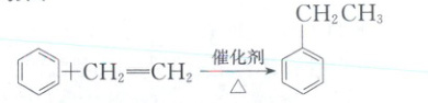 化学工业上制取乙苯(又称苯乙烷)、异丙苯,主要通过苯与乙烯或丙烯在催化剂存在条件下反应获得。以前采用无水$\mathrm{AlCl_3}$和浓盐酸作催化剂,污染较大而且成本较高。现在采用分子筛固体酸作催化剂,这种催化剂无毒、无腐蚀,且可完全再生。写出该反应的化学方程式,分析反应类型。