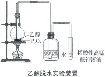 $ P_2 O_5$是该反应的催化剂,浓硫酸、$ Al_2 O_3$等也可作该反应的催化剂。反应的广口瓶中,水可以除去生成的气体中的挥发出的乙醇,酸性高锰酸钾溶液可以检验生成的乙烯气体。实验室中经常采用乙醇和浓硫酸共热发生脱水反应来获得乙烯或乙醚。