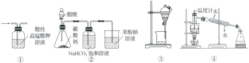 4.B 乙烯能被高锰酸钾氧化为二氧化碳,引入新的杂质,A错误;根据锥形瓶中有气泡判断产生二氧化碳,能证明醋酸的酸性比碳酸的酸性强,从锥形瓶中逸出的气体有二氧化碳和醋酸,醋酸被碳酸氢钠吸收,二氧化碳进入苯酚钠溶液中,根据溶液变浑浊判断碳酸的酸性强于苯酚,故可比较醋酸、碳酸、苯酚的酸性强弱,B正确;乙醇能与水互溶,故不能用乙醇进行萃取,C错误;分馏装置中冷却水的进出方向是下口进上口出,温度计应位于蒸馏烧瓶的支管口处,D错误。