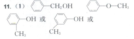 11. A、B、C三种物质的分子式都是$C_7H_8O$,若滴入$FeCl_3$溶液,只有C呈紫色;若投入金属钠,只有B没有变化。