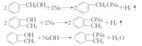 ,属于芳香醇,能与Na反应但不与NaOH、$NaHCO_3$反应。C为甲基苯酚,属于酚类,显酸性,可与Na、NaOH反应,但其酸性比碳酸弱,故不能与$NaHCO_3$反应。