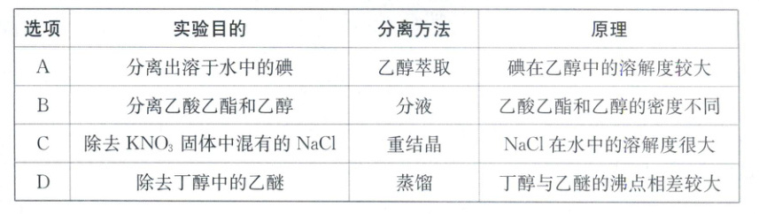 6.D乙醇与水互溶,不能用乙醇作萃取剂,A错误;乙酸乙酯与乙醇互溶,不能用分液法分离,B错误;NaCl在水中的溶解度受温度变化的影响较小,KNO₃在水中的溶解度受温度变化的影响较大,故除去KNO₃中的NaCl可用重结晶法,C错误;乙醚和丁醇互溶,但二者沸点差别较大,可用蒸馏法进行分离,D正确。