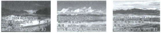 2025年暑假,王老师到某地进行地理考察,看到蓝天白云,天地相接,雪山连绵,绿草如茵。右图为 7 月 13—15 日王老师沿途拍摄的照片。据此回答 1~3 题。
