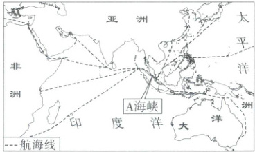 海峡作为海上交通线的“咽喉”,在全球海洋运输中具有重要地位。右图示意经过 A 海峡的航线。据此回答 6~7 题。
