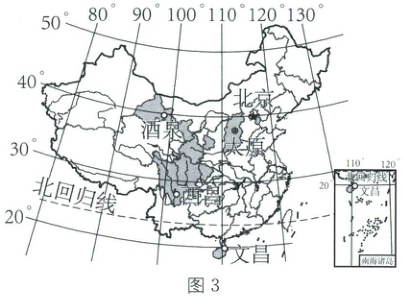 2025年2月12日,中国载人月球探测登月服“望宇”和载人月球车“探索”名称公布。2025年5月29日,天问二号小行星探测器在西昌卫星发射基地成功发射。图1为登月服和载人月球车图片,图2为地球公转示意图,图3为我国四大卫星发射基地分布图。据此回答1~4题。
