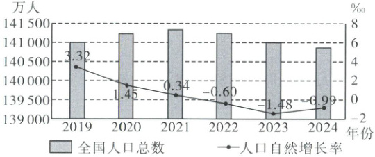 17.C 18.B [解析]第17题,读图可知,2019 - 2024年我国人口数量先增长后下降,2021年我国人口数量最多;人口自然增长率在2022年为-0.60‰,说明2022年人口出现负增长;2019 - 2023年人口自然增长率持续下降,但2023 - 2024年我国人口自然增长率从-1.48‰升为-0.99‰,改变了持续下降的趋势。故选C。第18题,“银发经济”是以服务老年人为主的经济,劳动力资源短缺与“银发经济”成为拉动经济发展重要力量的关联不大;随着老龄化社会到来,老年人口增长迅速,对老年服务、老年产品等的需求增多,从而推动了以服务老年人为主的“银发经济”发展,使其成为拉动我国经济发展的重要力量;延迟退休政策主要是关于劳动力就业时间的调整,教育水平普遍提高主要影响劳动力素质等方面,均与“银发经济”发展关系不大。故选B。