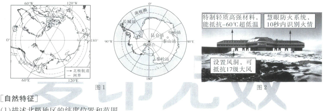 (1)北极地区主要位于北极圈(66.5°N)以北,包括北冰洋的大部分及其沿岸的亚、欧、北美三洲的陆地和岛屿。