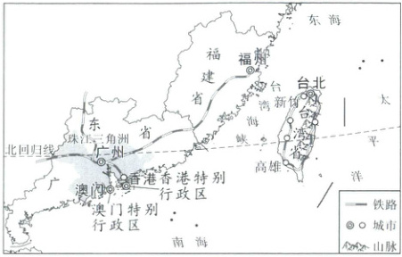 右下图为粤、港、澳、闽、台等省级行政区分布示意图。读图回答23~25题。