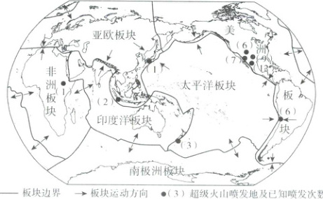 超级火山喷发是指喷发岩浆总质量大,且火山爆发指数达8级或以上的短时间爆破式喷发。右下图示意全球六大板块与超级火山喷发地分布。据此回答3~4题。