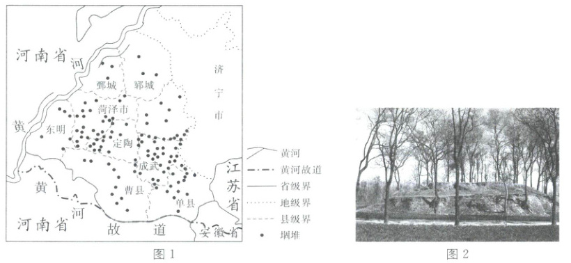 作为黄河入鲁第一市,菏泽因黄河下游独特的地理环境,孕育了历史悠久的堌堆文化。堌堆是古代先民们为躲避洪水在平原上堆积的土丘,遍布菏泽大地。图1示意菏泽现有堌堆的空间分布(2021年),图2示意菏泽堌堆景观图。据此回答17~18题。