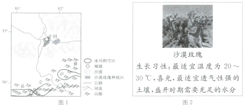 2025年5月,新疆于田县的10万株沙漠玫瑰迎来第一波花期。这些玫瑰是当地村民在塔克拉玛干沙漠边缘绿色防护带锁边“合龙”时种下的。图1为于田及其周边区域图,图2为沙漠玫瑰资料卡。据此回答19~20题。