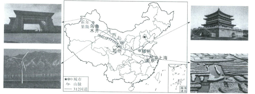 上海—霍尔果斯公路(又称 312 国道)是一条贯通我国东南和西北地区的交通大动脉,在“一带一路”中发挥着重要作用。暑假期间,贝贝一家从上海出发沿着 312 国道自驾前往霍尔果斯探亲,沿途感受到大美中国的地理差异。下图示意 312 国道及沿途部分景观。