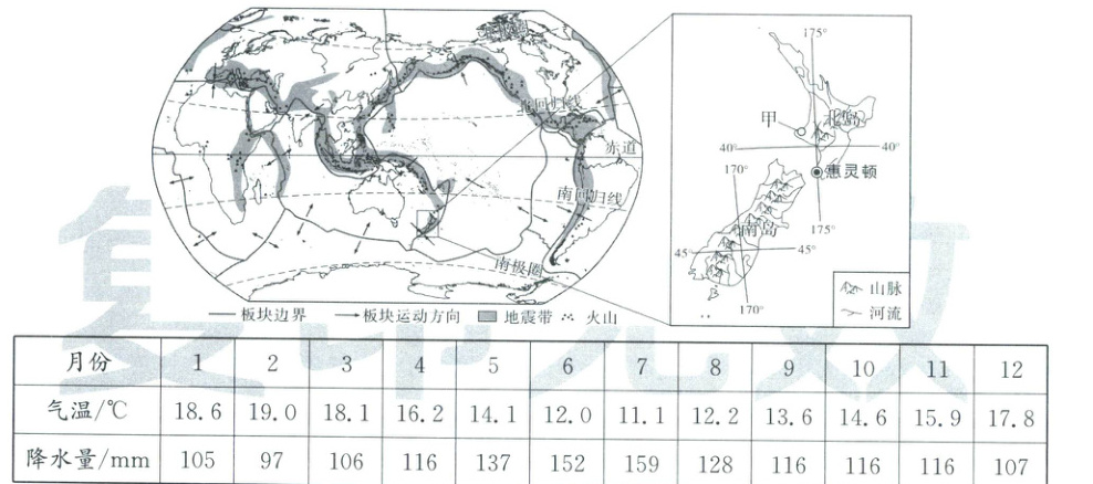 寒区汽车试验场是电动汽车进行冰雪高寒环境下试验的重要硬件设施,新西兰是世界上唯一拥有寒区汽车试验场的南半球国家。近年来,随着电动汽车产业的快速发展,我国车企多次在新西兰开展寒区汽车试验。下图示意全球板块分布及新西兰地理位置,下表示意新西兰北岛甲城市月平均气温和降水量。
