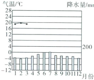 (1)根据表格信息在右图中完善纵坐标降水量信息和气温年变化曲线。