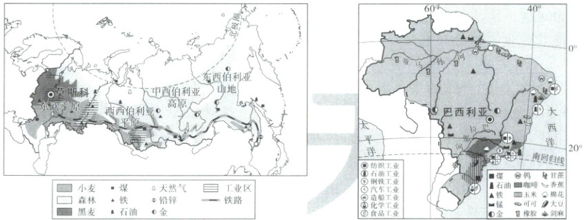 读俄罗斯和巴西简图,回答 12~13 题。