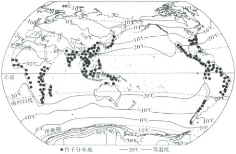 竹子“未出土时便有节,宁折不弯”的气节被人们广为称颂。竹子喜温暖湿润,对水热条件要求较高。读世界年平均气温和竹子分布图,回答 8~9 题。