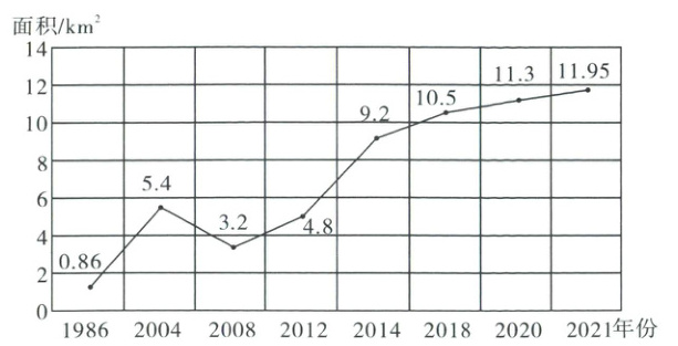 2024 年 10 月,某地球科学杂志发布的卫星监测数据显示,南极半岛的植被覆盖面积正在发生显著变化。2025 年 2 月,北极海冰的平均面积比同期平均水平低 8%,创下有记录以来的该月最低水平。读北极地区图和 1986—2021 年南极半岛植被覆盖面积变化图,回答 14~15 题。