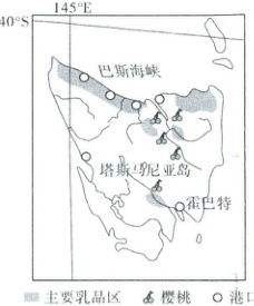 人文地理特征一般包括人口、城市、交通、经济、文化等方面的基本特征。右图为澳大利亚塔斯马尼亚岛的主要乳品区及樱桃种植区示意图。据图可知塔斯马尼亚岛上的人口和城市主要分布在