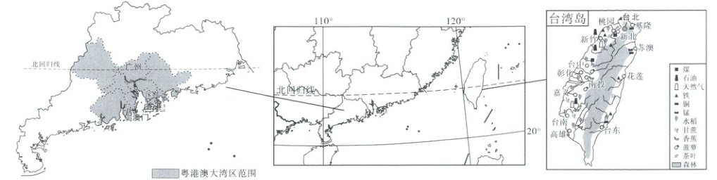 粤港澳大湾区包括香港、澳门和广东省 9 市,地理条件优越,经济腹地广阔。粤港澳大湾区与台湾岛毗邻,在经贸合作方面具有得天独厚的优势。读图回答 12~13 题。