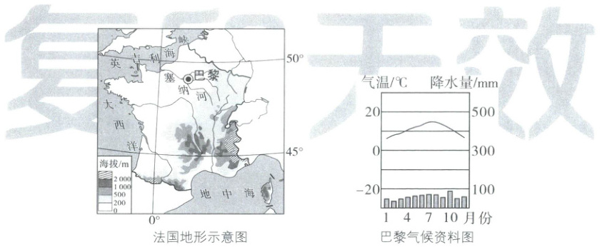 12.D 解析:第12题,读图可知,法国大部分地区海拔在200m以下,平原面积广大;法国地势东南高、西北低;根据巴黎气候资料图可知,巴黎1月平均气温在0℃以上,降水均匀,气候温和湿润,故法国大部分地区气候温和湿润,受海洋影响明显。故选D。