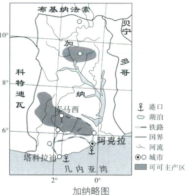 22.B 解析:第22题,读图可知:加纳铁路网并非四通八达,①错误;铁路线主要是连接国内城市与港口等,并非大多通往邻国,②错误;港口(如塔科拉迪、阿克拉)与铁路线相连,便于可可运输,③正确;可可最大产区有铁路线分布,便于将可可运往加工厂和港口,④正确。故选B。