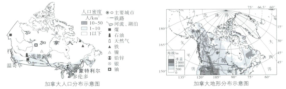 20.B 解析:第20题,加拿大北部纬度较高,气候寒冷,不适宜人类居住;南部纬度相对较低,气候较为温暖,适合人类生存和发展,故气候是影响加拿大人口分布的主要自然因素;据加拿大地形分布示意图可知,加拿大大部分地区地形平坦,故地形不是影响加拿大人口分布的主要因素;加拿大中部和北部有矿产资源的地方人口稀少,南部有矿产资源的地方人口稠密,故矿产资源不是影响加拿大人口分布的主要因素;加拿大北部的河流沿岸人口稀少,南部没有河流的地方人口也较为稠密,故河流不是影响加拿大人口分布的主要自然因素。故选B。