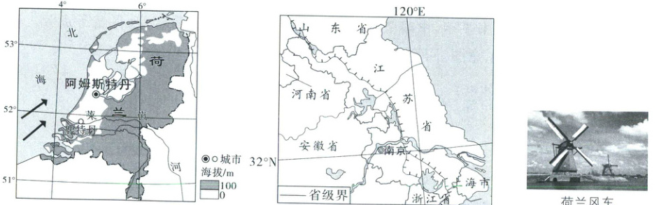材料三 荷兰和我国江苏省简图、荷兰风车图