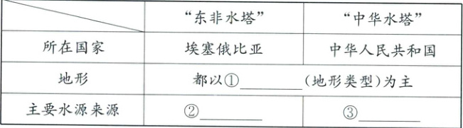 (2)我国三江源地区因为海拔高,雪山冰川广布,成为许多大江大河的发源地,被称为“中华水塔”。根据图文材料可知,埃塞俄比亚海拔高,降水多,成为“东非水塔”。