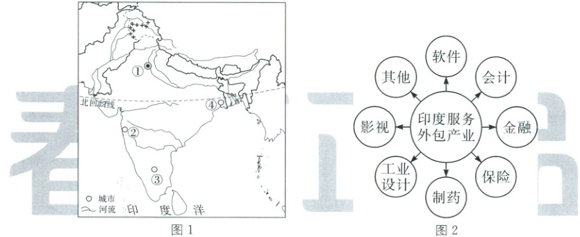 材料三 图1为印度简图,图2为印度服务外包产业主要类型图。