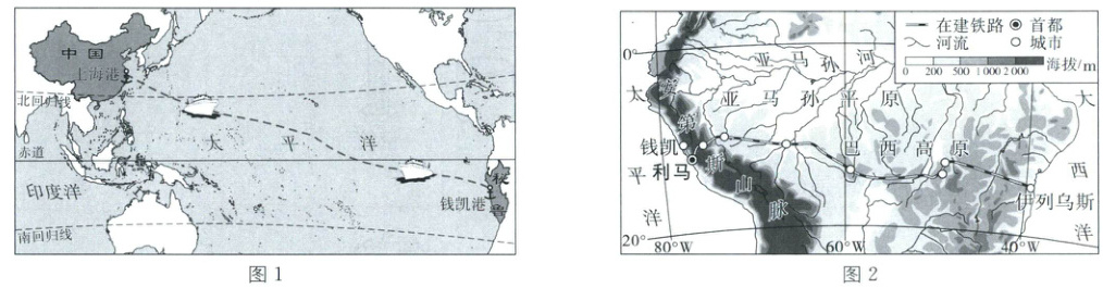 (1)根据材料一可知,钱凯港是天然深水良港;读图1可知,钱凯港临近太平洋,从南美洲东海岸到亚洲不需要绕道巴拿马运河,可以缩短与亚洲等国家的航线距离;钱凯港连接着“两洋铁路”,经济腹地广阔,可以辐射南美洲。