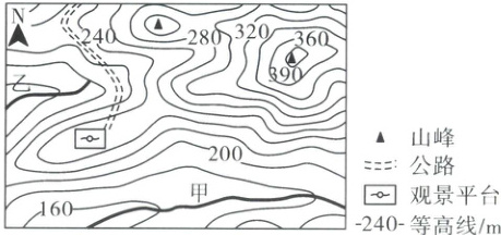3.C 4.D 解析 第3题,在等高线地形图中,两山峰的相对高度可以通过两山峰之间的等高线数值计算。读图可知,该等高线地形图的等高距为20m。其中一山峰海拔为390m,另一山峰海拔为300~320m,所以两山峰的相对高度为70~90m。故选C。第4题,依据该地图中指向标可知,公路延伸方向大体为南北方向;蹦极项目需在陡崖处开发,而图示区域等高线没有重叠,说明该区域没有陡崖,不适合开发蹦极项目;观景平台通常设置在山脊或山顶以获得良好视野,图示区域观景平台在山脊部位(等高线向海拔低处弯曲);河流流速取决于坡度,坡度越大则流速越快,乙河流经区域等高线比甲河流经区域更密集,所以乙河流速更快。故选D。