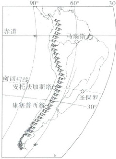 读南美洲位置及部分城市分布图,回答 5~6 题。