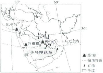 第十届亚洲冬季运动会将于 2029 年在沙特阿拉伯举行。 近年来,该国陆续获得多项国际赛事主办权,积极探索经济转型之路。读沙特阿拉伯在西亚的位置简图,回答 8~9 题。