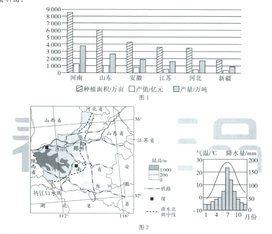 材料三 图 1 为 2022 年我国小麦种植面积、产值、产量前 6 位省区统计图,图 2 为河南省简图及郑州气候资料图。