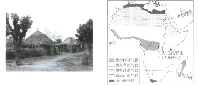 茅草屋是非洲典型的传统民居,使用树枝、木棍架构,房顶铺茅草。 读茅草屋景观及非洲气候类型分布图,回答 9~10 题。