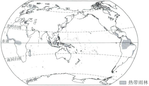 热带雨林有净化空气、调节气候、维持生物多样性等作用。 读热带雨林全球分布图,回答 7~8 题。