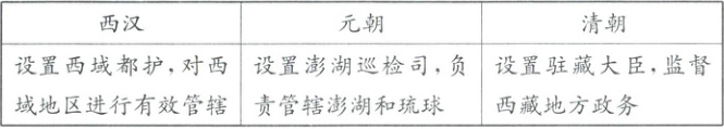 3.D [解析]本题考查中国古代历代政府治理边疆的措施。根据材料并结合所学知识可知,公元前60年,西汉朝廷设置西域都护府,标志着西域正式归属中央政权;元朝在澎湖岛设置了澎湖巡检司,负责管辖澎湖和琉球(今台湾),这是历史上中央政府首次在台湾地区正式建立的行政机构;1727年,清朝在西藏设置驻藏大臣,监督西藏地方政务,有效地加强了对西藏的管辖。因此,材料措施体现了中国古代政府对边疆地区的治理与管辖。故选D项。