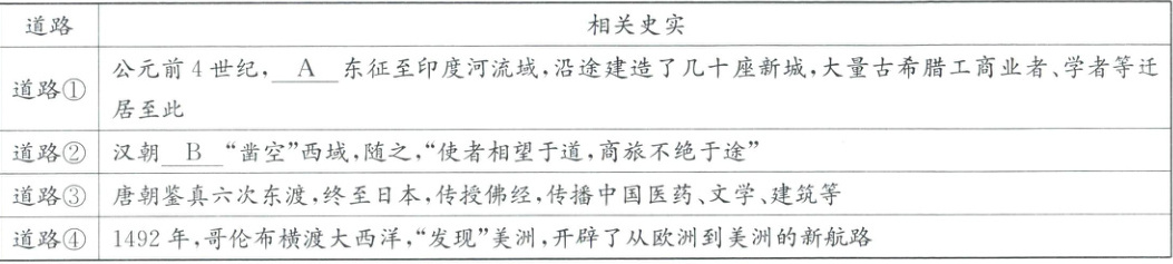 (1)A:亚历山大;B:张骞。道路①是武力手段;道路二②是和平交流。促进了东西方经济文化的交流。