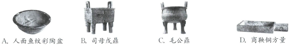 2. B [解析]本题考查商朝的青铜文明。结合所学知识可知,司母戊鼎出土于河南安阳,即殷墟遗址,是迄今世界上出土的最重的青铜器,是商朝时期青铜文明的代表,故B项正确;人面鱼纹彩陶盆出土于陕西西安半坡遗址,排除A项;毛公鼎属于西周时期的青铜器,排除C项;商鞅铜方量是战国时期商鞅变法的见证,排除D项。
