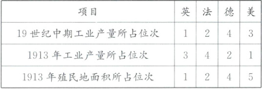 22. 表 1 是 19 世纪末 20 世纪初西方列强经济实力及其占有殖民地情况简表。 它可用于研究第一次世界大战的(